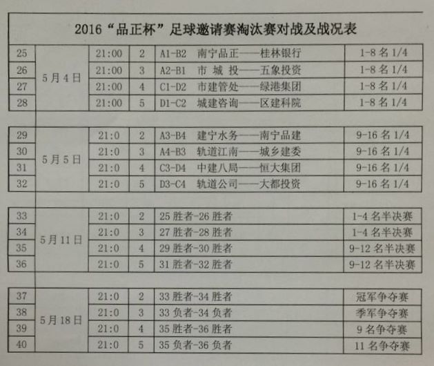 1/4淘汰賽將于5月4日進(jìn)行,分別由A組第一南寧品正對B組第二桂林銀行、A組第二市城投對B組第一五象投資、C組第一市建管處對D組第二綠港集團、C組第二區建科院對D組第一市城建咨詢(xún)。