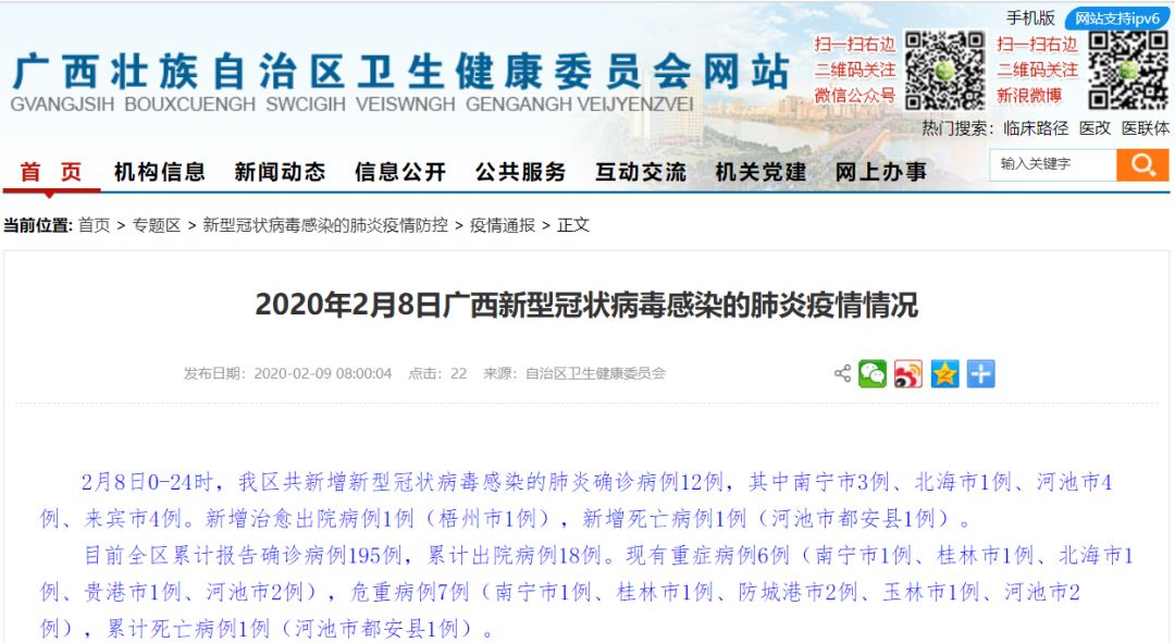 2020年2月9日上午,廣西壯族自治區衛生健康委發(fā)布通報,2月8日0-24時(shí),河池市新增4例新冠肺炎確診病例。報告死亡病例1例(都安縣病例)。