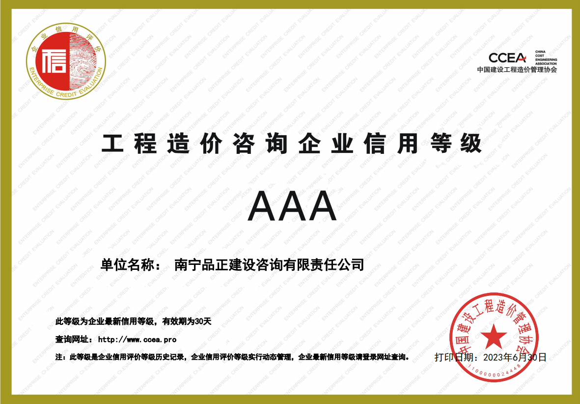 2023年3月至6月,南寧品正建設咨詢(xún)有限責任公司參加中國建設工程造價(jià)管理協(xié)會(huì )組織的2023年第一批工程造價(jià)咨詢(xún)企業(yè)信用評價(jià),順利通過(guò)初評、終評,榮獲中國建設工程造價(jià)管理協(xié)會(huì )最高等級AAA級信用等級(中價(jià)協(xié)〔2023〕40號文),我公司自2017年以來(lái),已經(jīng)連續6年獲此殊榮。
