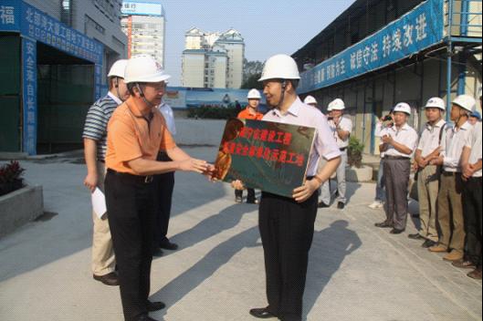 南寧市建筑管理處黨委書(shū)記馮仕文(左)授牌,區五建項目經(jīng)理接牌