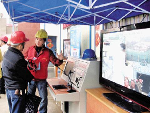 參觀(guān)者向工作人員了解“標準化”工地的現場(chǎng)監控操作