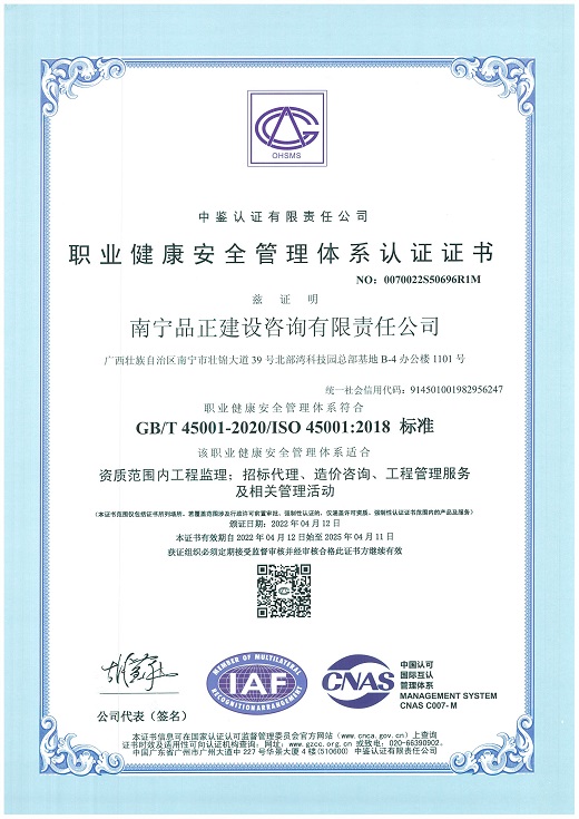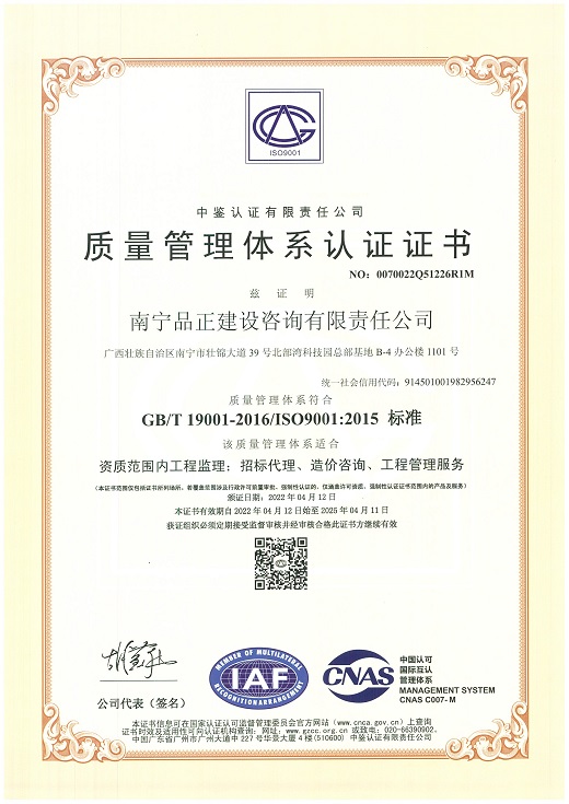南寧品正于2000年通過(guò)ISO9001:2000質(zhì)量體系認證,2009年改版為ISO9001:2008并通過(guò)認證;2016年5月同時(shí)通過(guò)GB/T19001-2008質(zhì)量管理體系、GB/T28001-2001職業(yè)健康安全管理體系認證和GB/T24001-2004環(huán)境管理體系三體系認證。公司長(cháng)期重視管理體系認證與實(shí)際工作的結合,制定行之有效的檢查及內審程序文件,形成了完整的《管理手冊》、《程序文件》、《標準作業(yè)指導書(shū)》三個(gè)層次的質(zhì)量體系文件。每年定期進(jìn)行工作質(zhì)量檢查、質(zhì)量體系內審和管理評審,確保公司整體質(zhì)量、環(huán)境和職業(yè)健康安全工作的有效性、持續性,達到規范化和標準化。